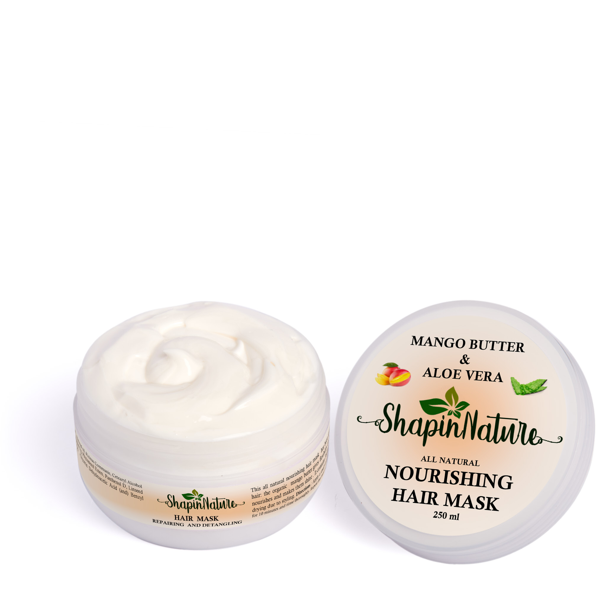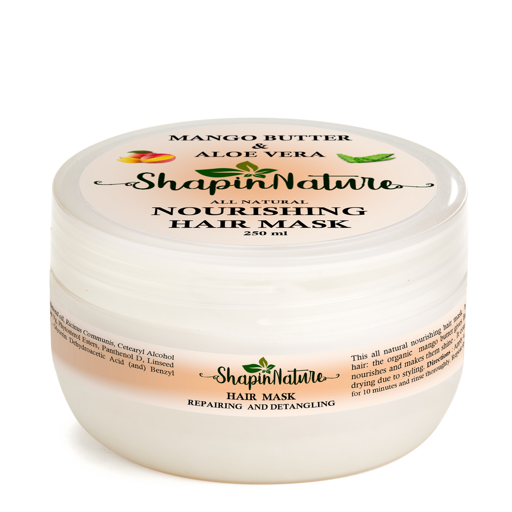 Μάσκα μαλλιών με βούτυρο μάνγκο και αλόη η μάσκα αυτή είναι γεμάτη από υπέροχες ιδιότητες, ενυδατώνει βαθιά και τρέφει τα μαλλιά τα οποία έχουν υποστεί χημικές διεργασίες είναι ξηρά και θαμπά. Βελτιώνει και βοηθάει στην πρόληψη του σπασίματος των μαλλιών, στη δύναμη και την ελαστικότητα της τρίχας κάνοντας τα πιο μαλακά και υγιή. Το μάνγκο είναι ένα τροπικό εποχιακό φρούτο και μία φυσική ενυδατική πηγή πλούσια σε βιταμίνη Α, βιταμίνη C και Ε οι οποίες βοηθούν και θεραπεύουν το ερεθισμένο τριχωτό της κεφαλής, την επιδερμίδα του κεφαλιού και προάγει την υγιή ανάπτυξη των μαλλιών. Τα φυσικά ένζυμα που βρίσκονται στην αλόη βέρα, συμβάλλουν στην εξάλειψη της πιτυρίδας εξισορροπείται το pH, προσθέτοντας όγκο χωρίς να βαραίνει. Μειώνει την ξηρότητα και το αίσθημα φαγούρας που την συνοδεύει. Διατηρεί τα μαλλιά σας υγιή και γερά. Χαρίζει βελούδινη αίσθηση χωρίς φριζάρισμα. Ενυδατώνει ρυθμίζοντας τον βαθμό υγρασίας και προσθέτει εξαιρετική φωτεινότητα. Η μάσκα Shapin’Nature Mango & Aloe είναι μια εντατική θεραπεία περιποίησης για ξηρά, ή κατεστραμμένα μαλλιά και βοηθά στη θρέψη, την προστασία και την ενυδάτωση τους. Με το φρέσκο δροσερό άρωμα λουλουδάτης καθαρότητας από τα αιθέρια έλαια παλμαρόσα και λεβάντα.